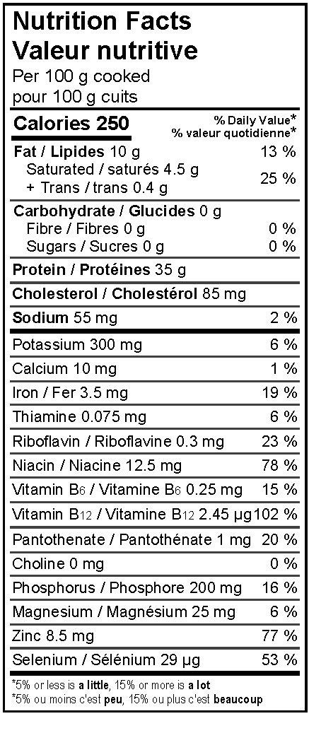 Nutrient values from Health Canada, Canadian Nutrient File, 2015. Food code 6172. Choline value obtained from U.S. Department of Agriculture, Agricultural Research Service. FoodData Central (2019) NDB #13361.