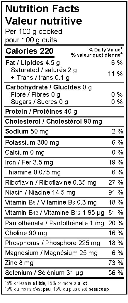 Per 100g cooked portion Inside Round Steak: 220 Calories, 40g Protein (Excellent Source*, Complete Protein**), 4.5g Fat, 0g Carbohydrate, 50mg Sodium
