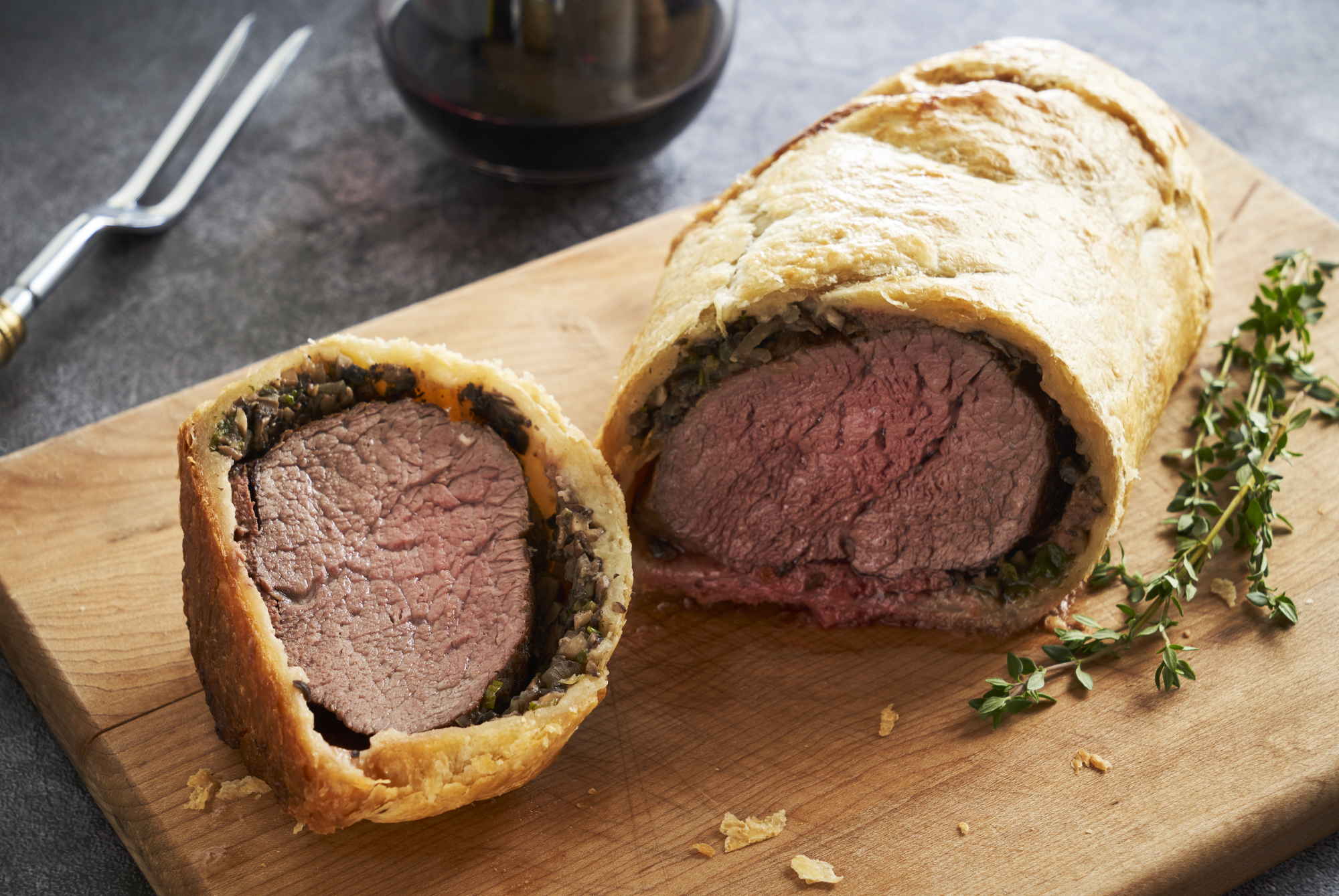 7. Bake Wellington until golden brown (shielding with loose cover of aluminum foil if getting to brown), and digital instant-read thermometer inserted into centre of roast reads 145°F (63°C) for medium-rare doneness, about 35 minutes.