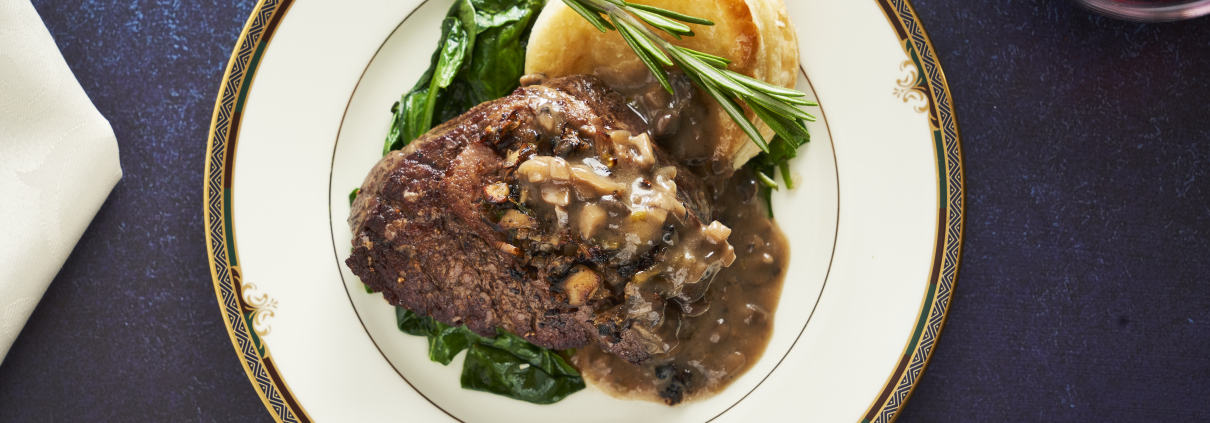 5. Meanwhile, top each beef medallion with pâté slices and mushroom mixture. Bake in oven for 8 to 10 minutes or until digital instant-read thermometer inserted sideways into centre of medallions registers 145°F (63°C) for medium-rare (or 160°F/71°C for medium, or 170°F/77°C for well-done) to finish.