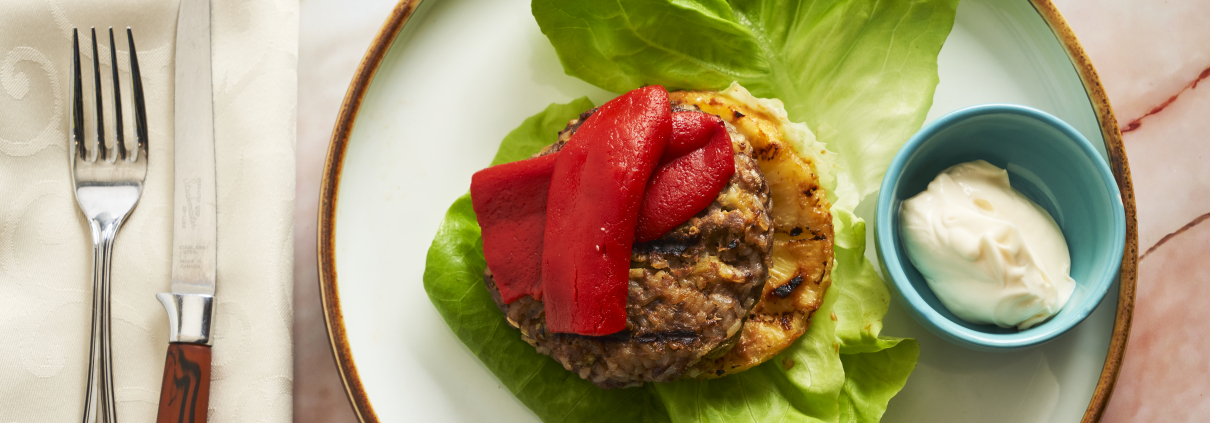 4. Stack pineapple on lettuce leaves and top with burger patties and roasted red peppers; fold lettuce around burgers like a wrap to pick up and eat.
