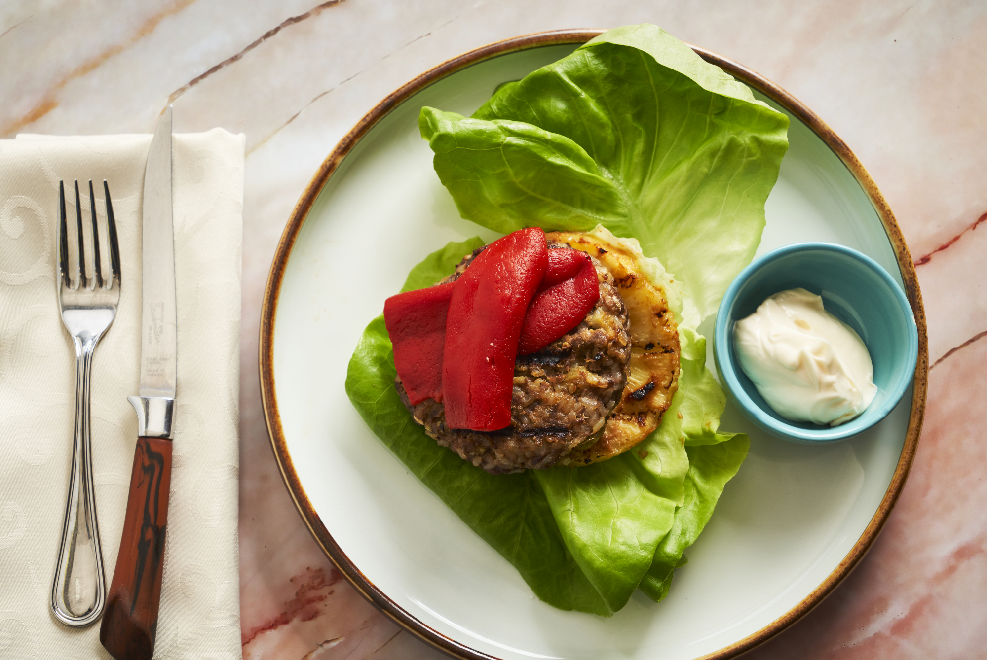 4. Stack pineapple on lettuce leaves and top with burger patties and roasted red peppers; fold lettuce around burgers like a wrap to pick up and eat.