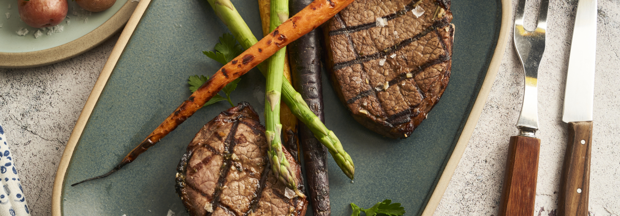 Aromatic vegetables and herbs and wine permeate Eye of Round steaks as they marinate. This is a perfect special meal made with value-priced steaks. Grill tender carrots and new potatoes to serve alongside.