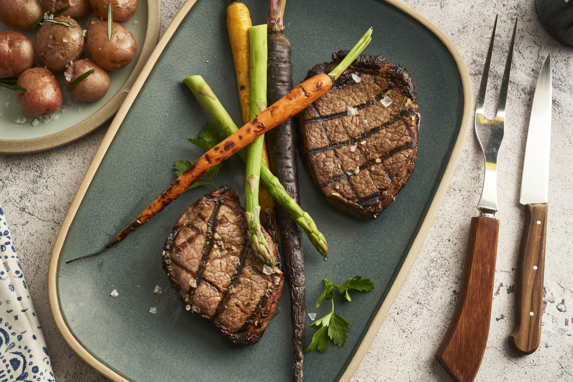 Aromatic vegetables and herbs and wine permeate Eye of Round steaks as they marinate. This is a perfect special meal made with value-priced steaks. Grill tender carrots and new potatoes to serve alongside.