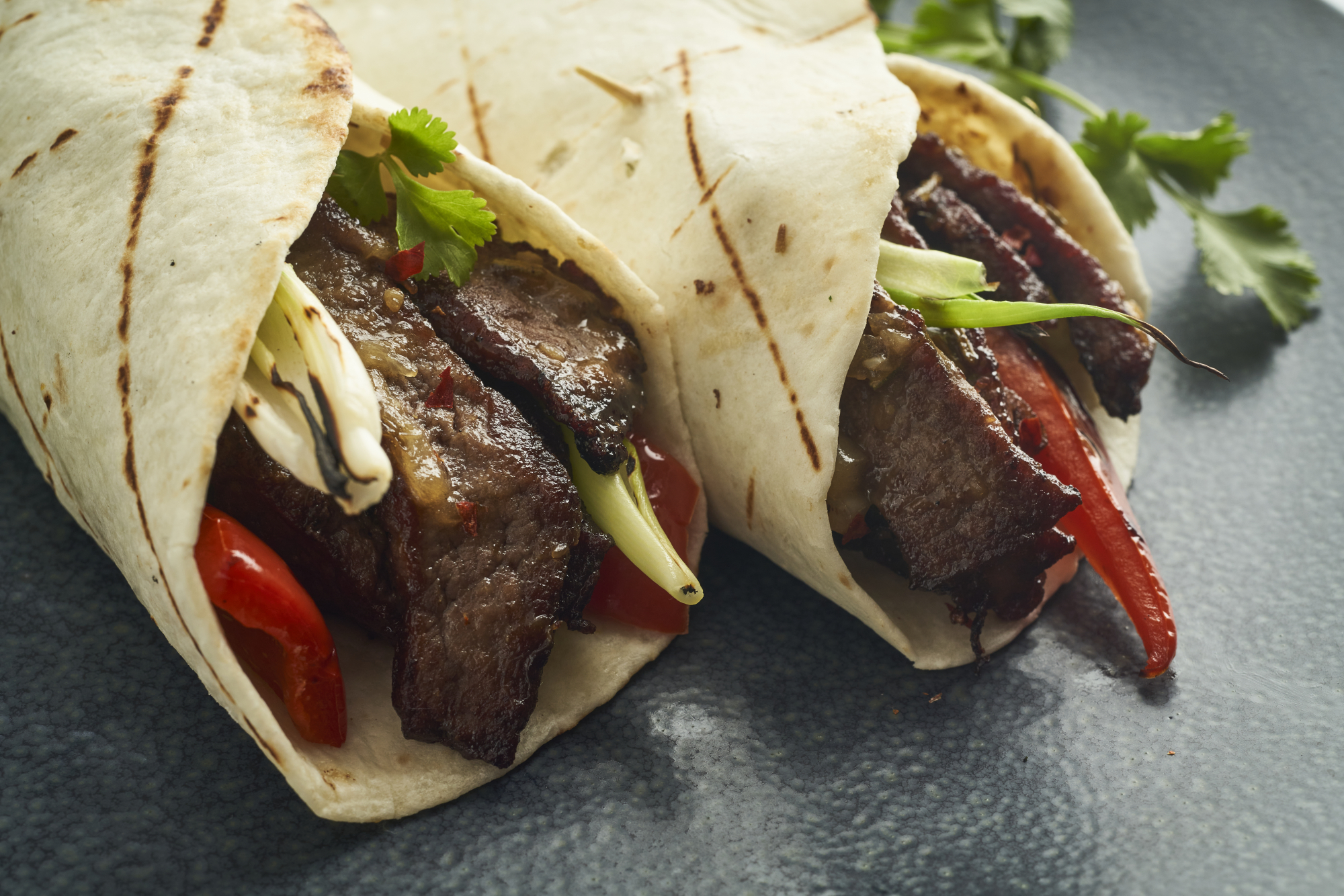 5. Top warmed tortillas with beef strips, grilled peppers and green onions and fresh cilantro (if using); fold up to eat.