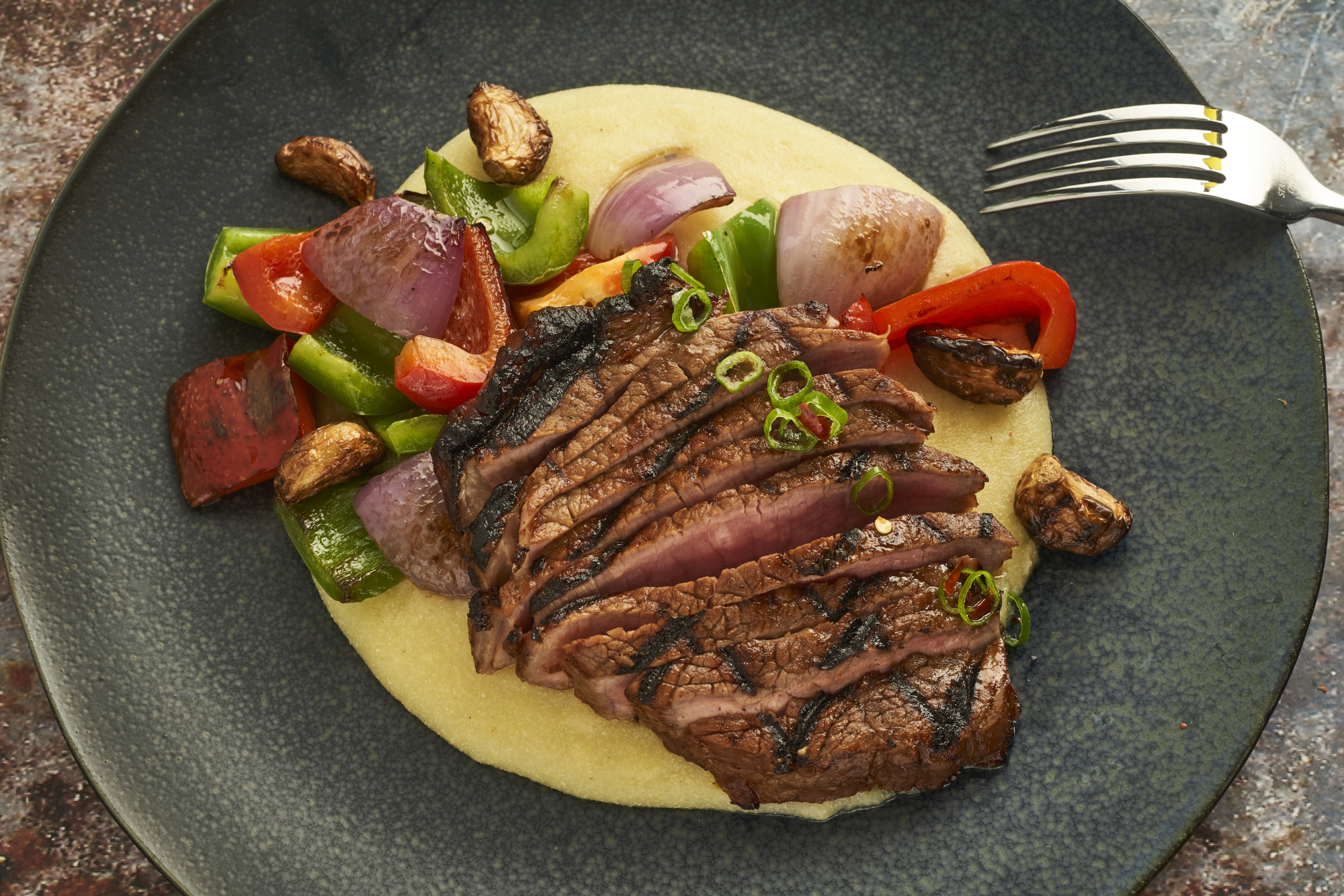 5. Slice steaks thinly across the grain at a 45-degree angle. Serve with stir-fried vegetables and garnish with green onions.